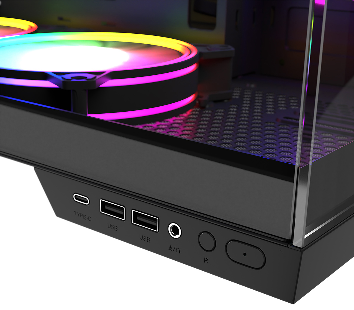 Panel z wejściami USB / Audio znajduje się w dolnej części obudowy. Ponieważ obudowa z racji swego wzornictwa będzie w większości przypadków stała na biurku, dostęp do panelu I/O jest w zasięgu ręki. Na panelu znajdziesz 2 złącza USB 3.0 oraz jedno złącze USB-C. Natomiast wejście na mikrofon i słuchawki umiejscowione zostało w gnieździe typu combo. Jest tu także przycisk do zmiany podświetlenia LED wentylatorów. Wymiary obudowy: 433*295*388 mm (L*W*H), filtry przeciwkurzowe: dół, góra, bok obudowy.