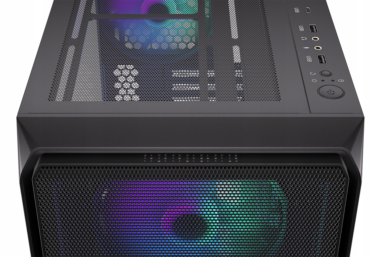 - Wyjścia górny panel: 1× USB-C, 2× USB-A, 1× słuchawki (minijack 3,5 mm), 1× mikrofon (minijack 3,5 mm), 1× przycisk POWER, 1× przycisk RESET/LED
