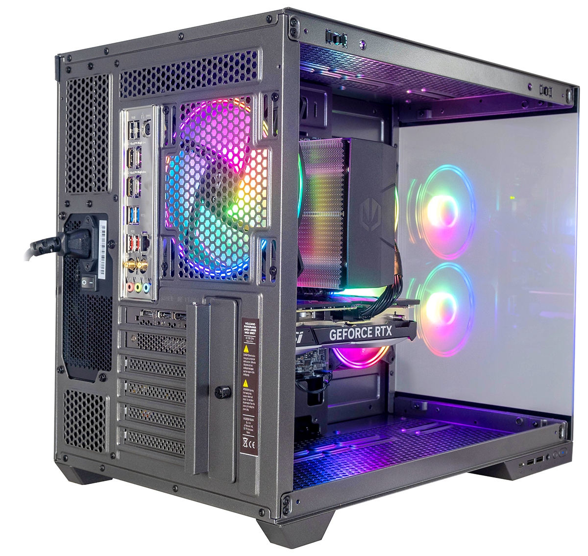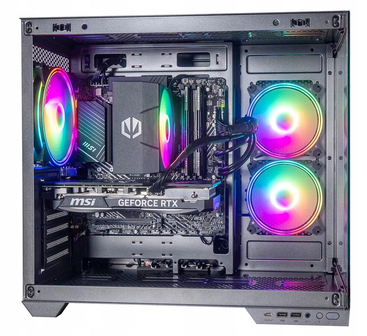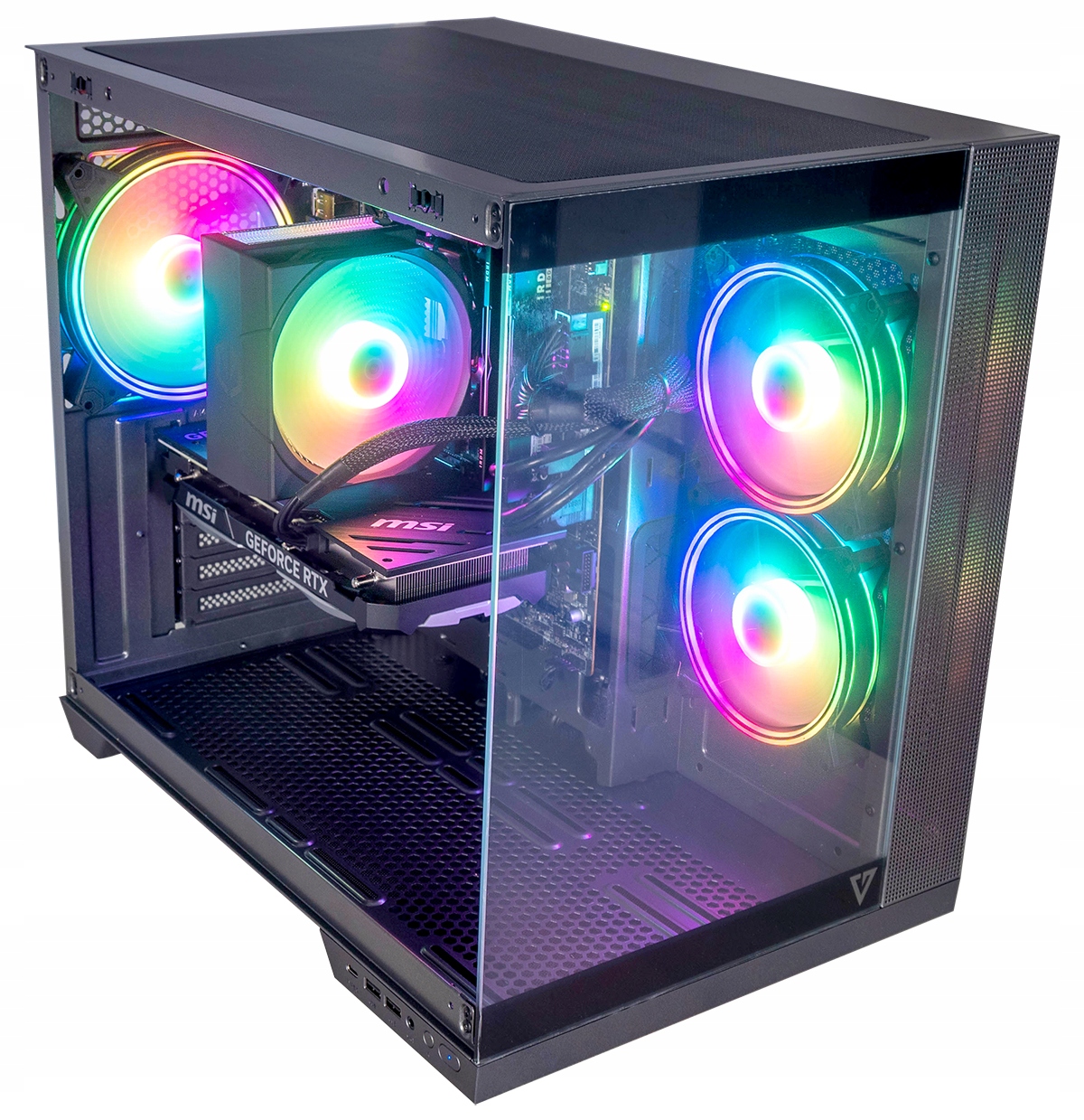 Obudowa posiada dwukomorową konstrukcję, gdzie pionowo montowany zasilacz odseparowany został od części montażowej. Została wyposażona w kontroler wentylatorów ARGB umocowany w części serwisowej obudowy. Łącznie można podłączyć 9 wentylatorów, a w tej wersji otrzymujesz aż 3 fabrycznie zamontowane wentylatory ARGB.